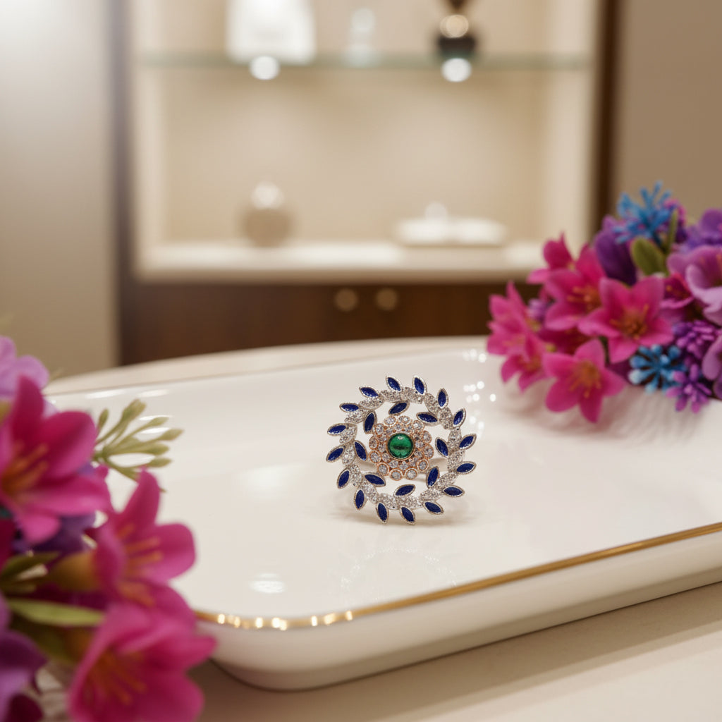 The Azure Bloom Royale Silver Ring is a striking floral statement crafted for refined elegance. A vivid green center stone anchors the design, surrounded by a radiant halo of marquise-cut sapphire-blue stones that form a blooming floral crown. Micro pavé detailing adds depth and brilliance, creating a luxurious play of color and light.