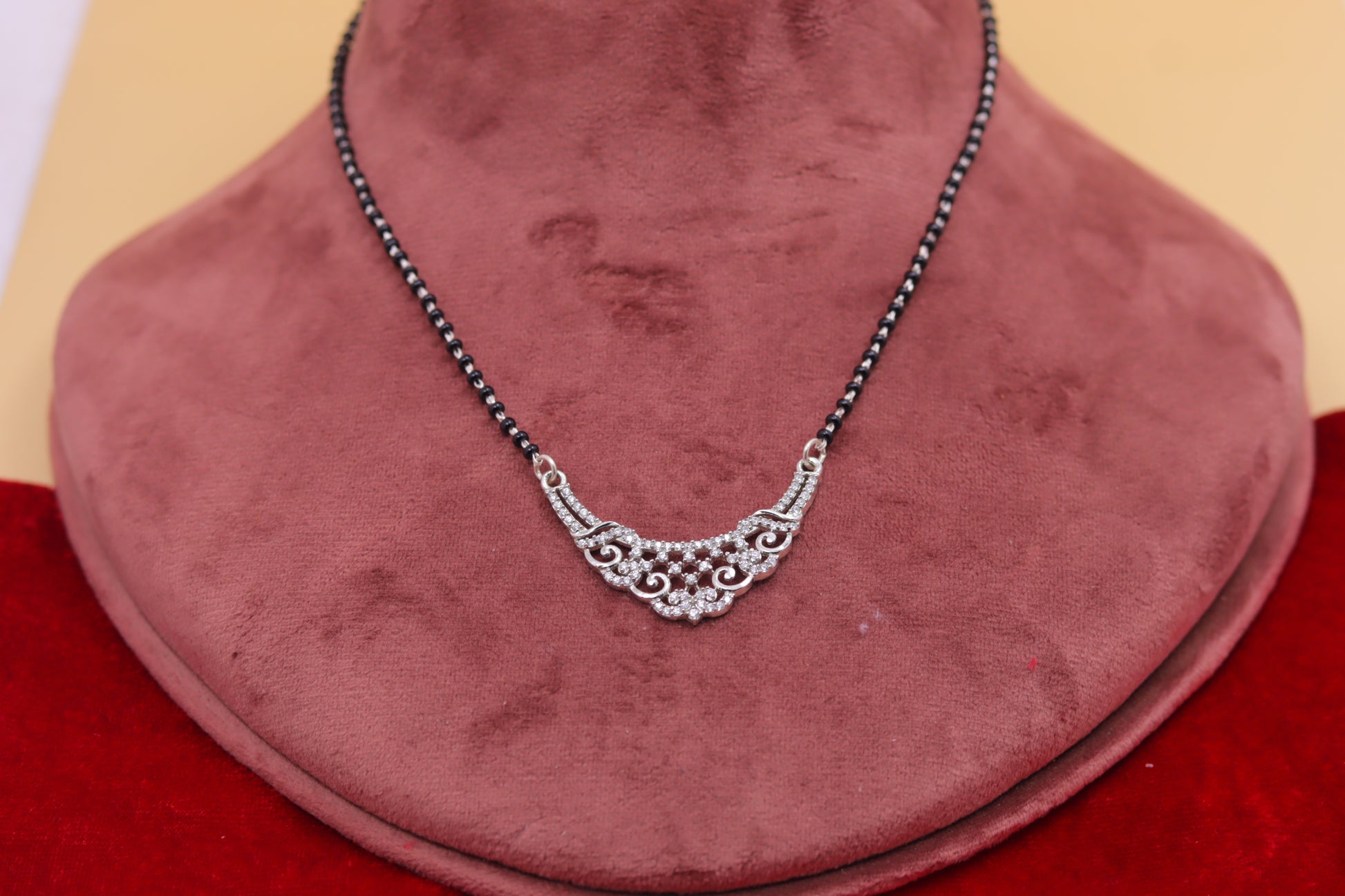 This graceful silver mangalsutra features a beautifully curved pendant adorned with fine, sparkling stones that create a soft yet luxurious shimmer. Paired with a classic black bead chain, the design reflects a perfect balance of tradition and modern elegance.