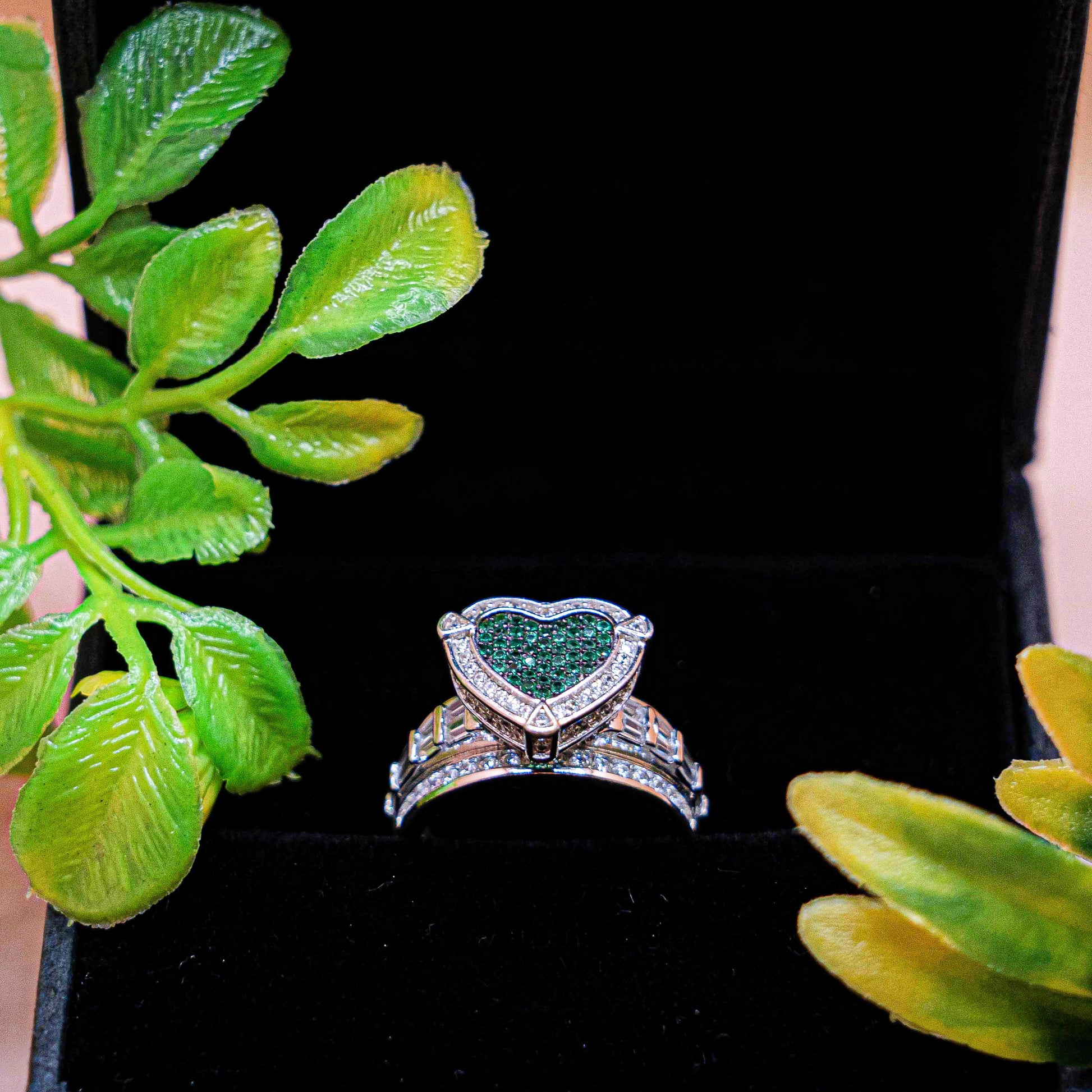 Styled against a black velvet base with fresh green accents, this ring looks luxurious, bold, and premium—perfect for high-impact visual merchandising.