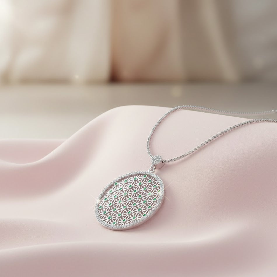 Emerald Lattice Silver Pendant ek luxury-inspired design hai jo modern elegance ko represent karta hai.