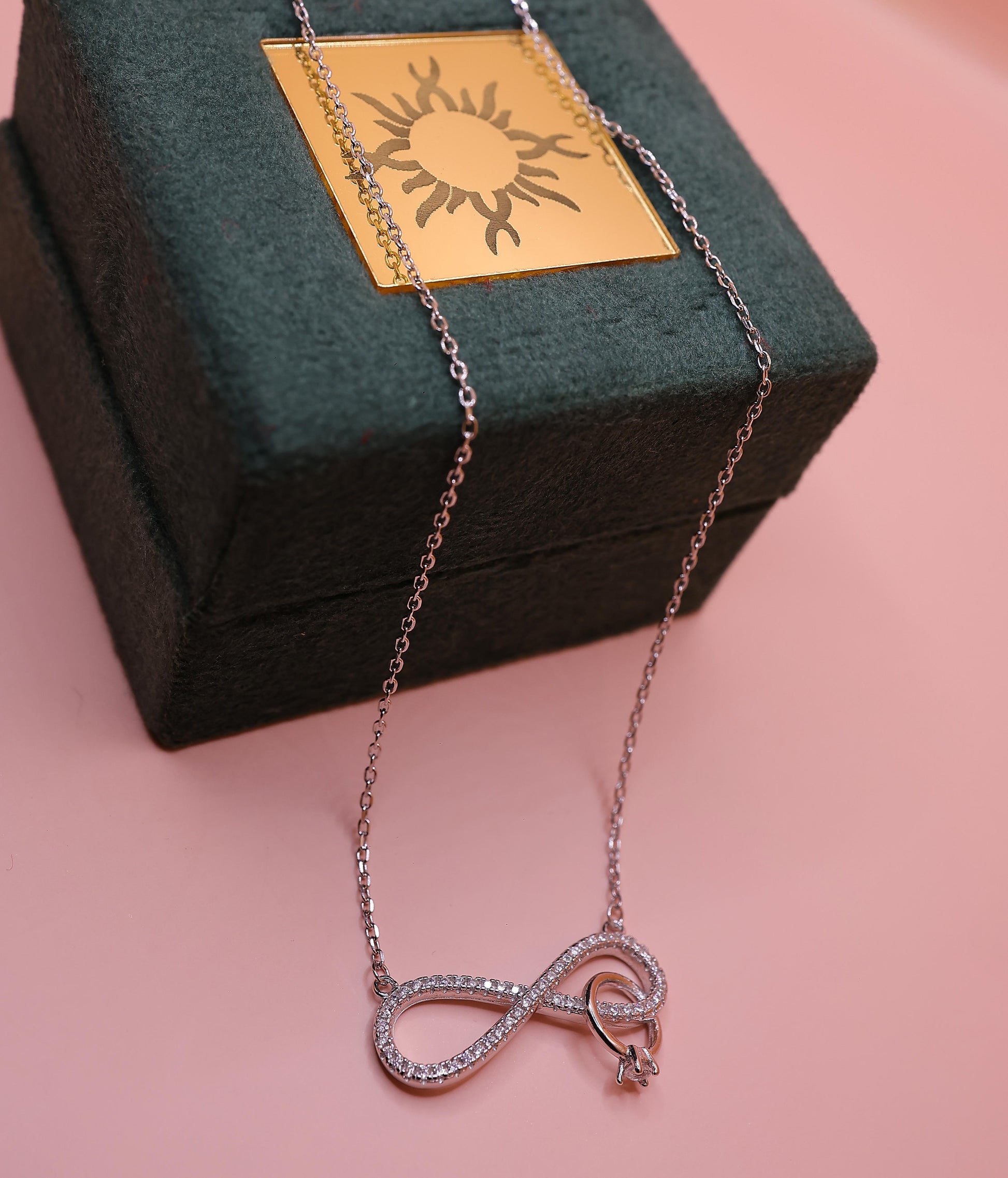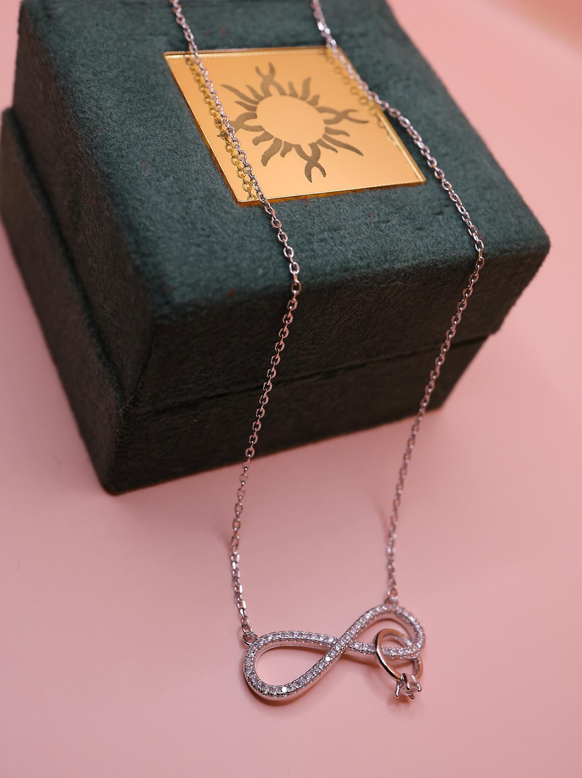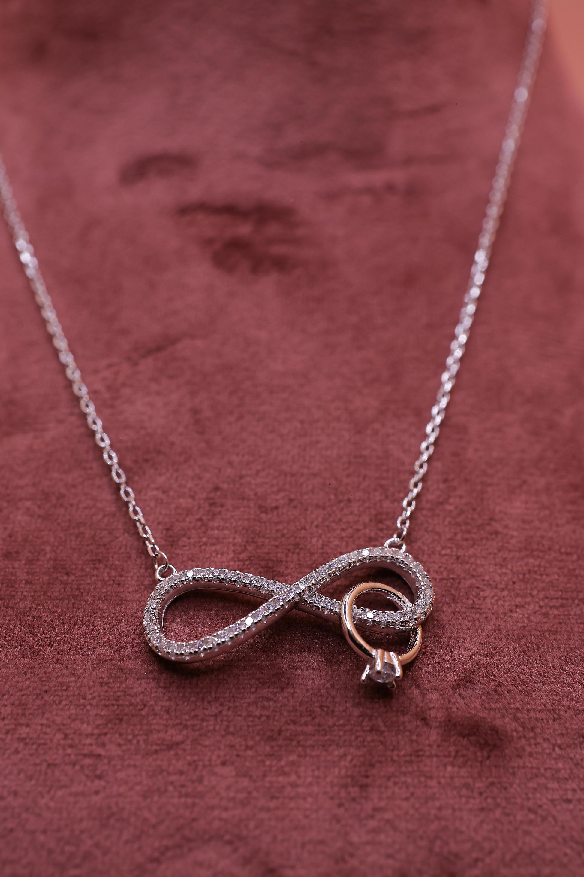 The Forever Infinity Knot Silver Chain Pendant is a timeless symbol of endless love, connection, and elegance. Crafted in premium silver, this pendant features a graceful infinity loop design delicately embellished with shimmering stones and finished with a subtle rose-gold tone accent, adding warmth and sophistication. The sleek chain completes the look with refined simplicity.