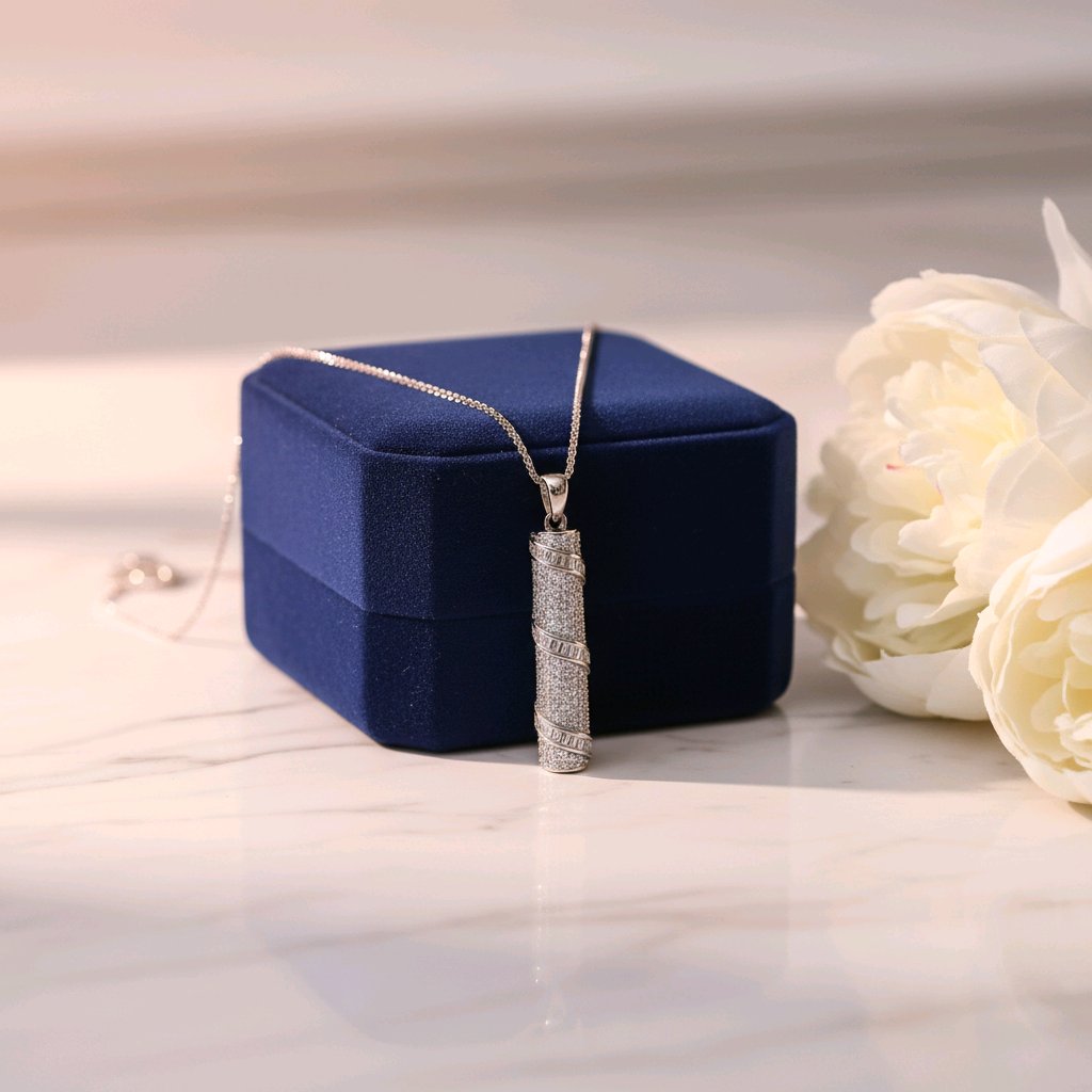 The Infinity Spark Diamond Pendant is designed for those who appreciate modern luxury with timeless appeal. This elegant cylindrical pendant features a graceful spiral design, fully encrusted with premium American Diamonds that deliver a brilliant, mirror-like sparkle under every light.