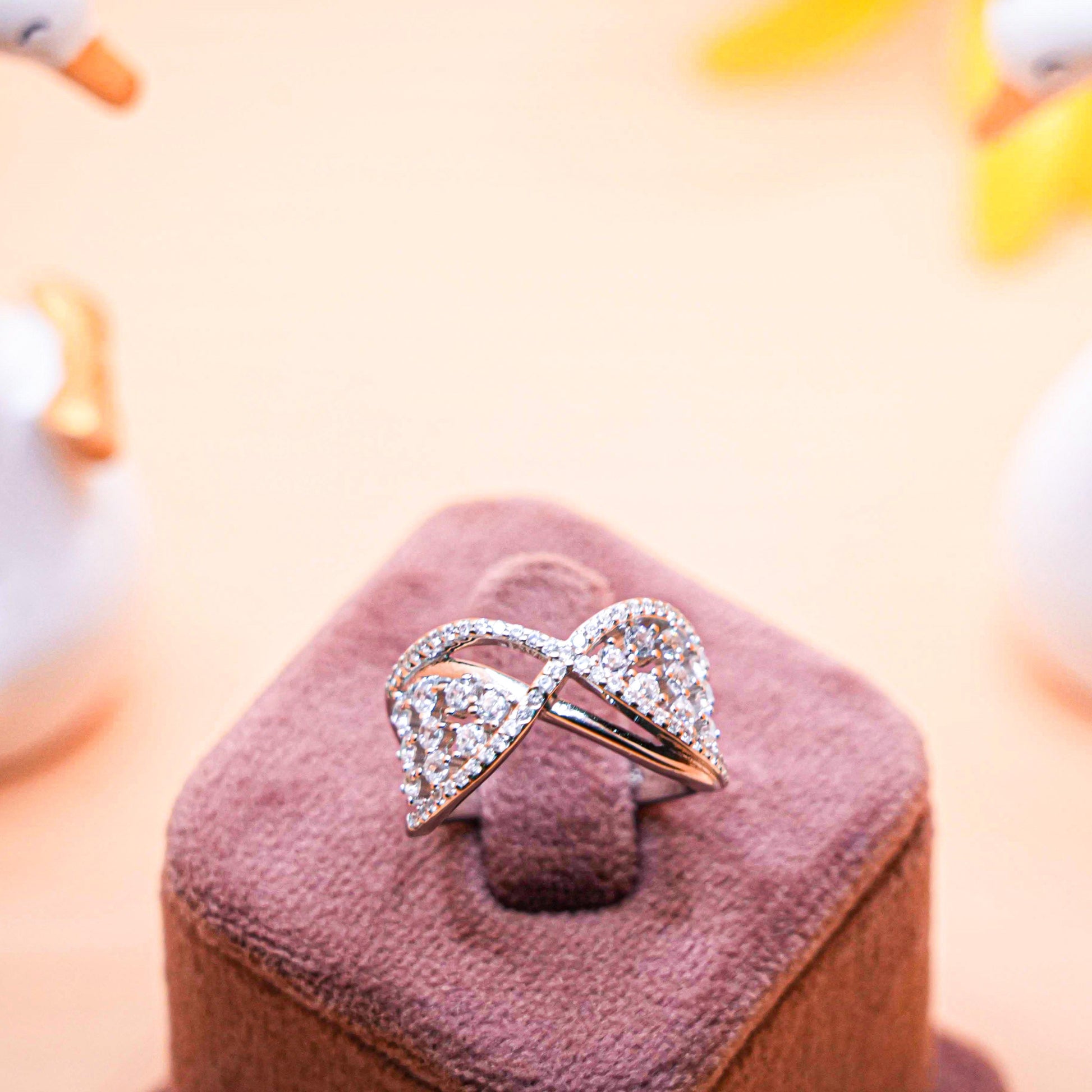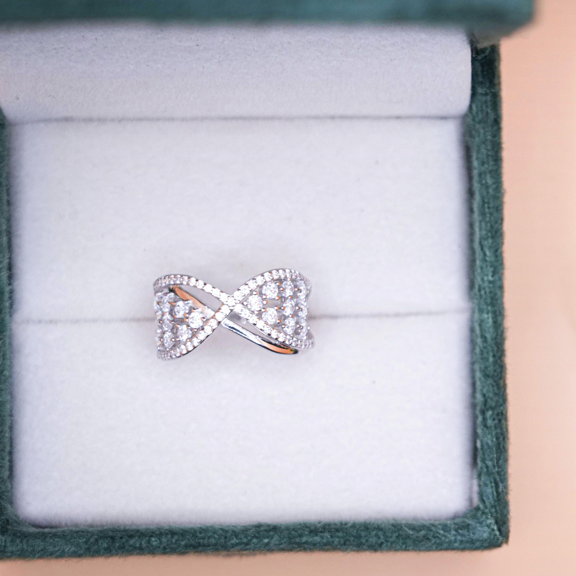 The "Infinity Spark Ring" is a graceful and modern ring, designed in a criss-cross style that mimics the shape of an infinity symbol. The arms of the ring are encrusted with small dazzling stones, creating a stunning contrast of shine and open space. This ring represents endless love, balance, and eternal connection, making it perfect as a meaningful gift or personal statement.
