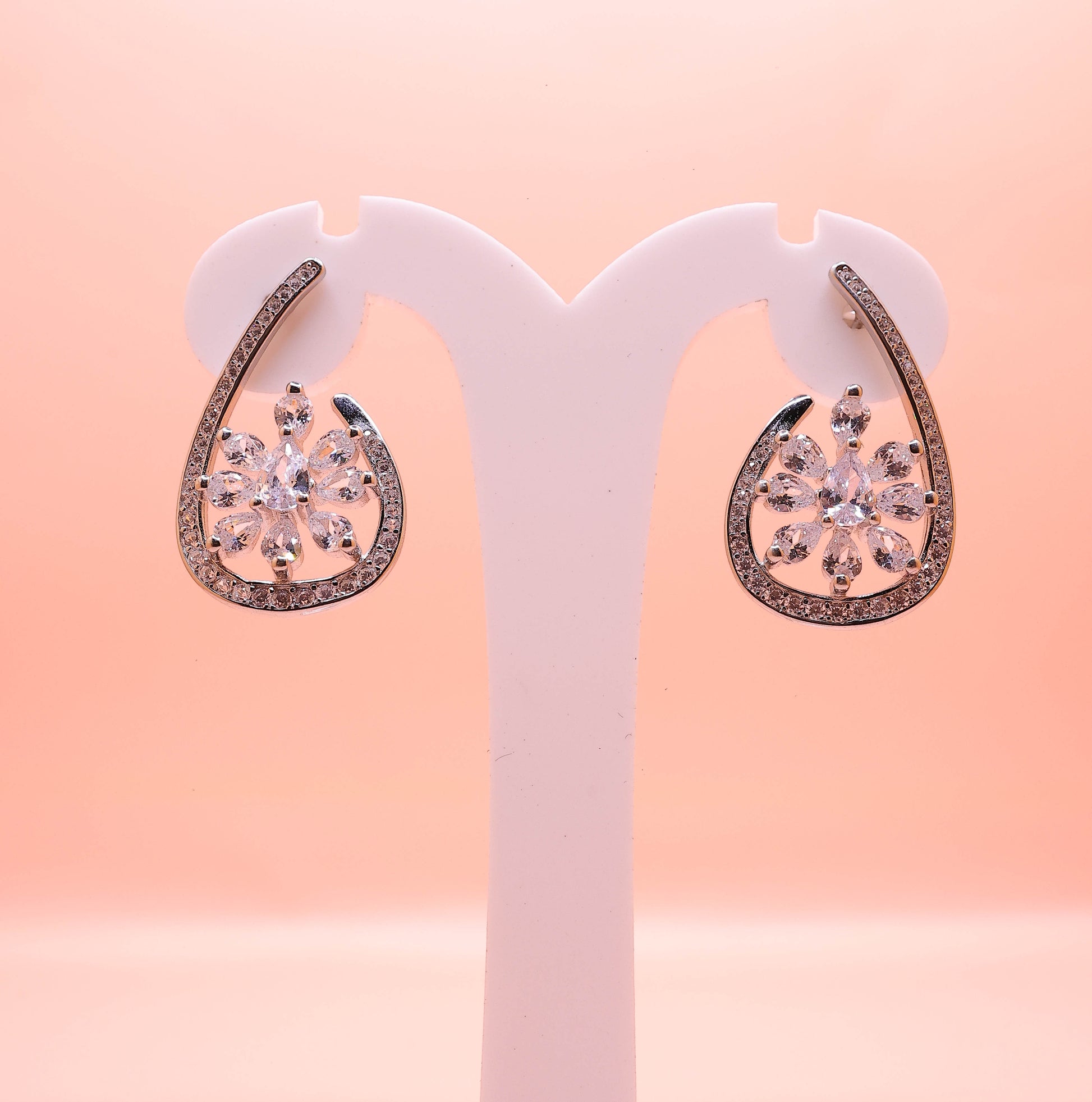 The Ivory Bloom Silver Drop Earrings capture the beauty of delicate florals with a refined, contemporary touch. Crafted in premium silver, these earrings feature an elegant petal-inspired floral motif accented with finely set shimmering stones. The graceful drop silhouette adds softness and movement, creating a luminous sparkle that elevates both everyday elegance and special-occasion looks.