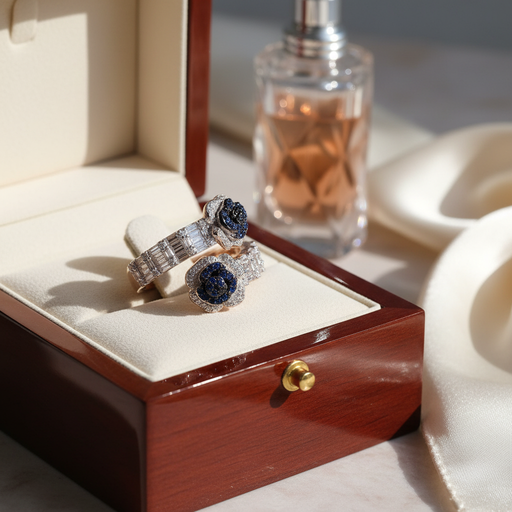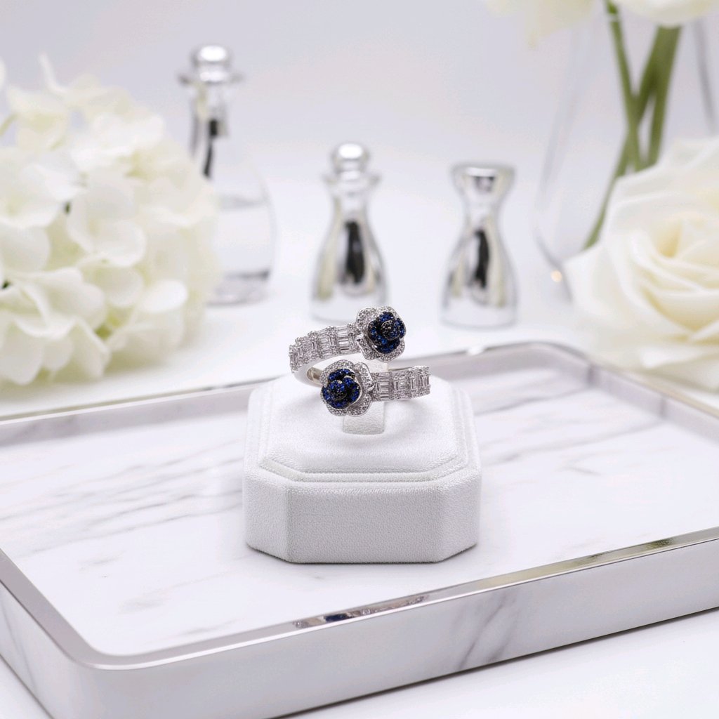 The Midnight Bloom Sapphire Silver Ring is a graceful fusion of luxury and refined craftsmanship. Crafted in premium silver, this ring features a delicate floral centerpiece highlighted by a deep sapphire-blue stone cluster, surrounded by sparkling baguette and micro-stone accents. The structured band design adds strength and brilliance, creating a sophisticated statement with a soft feminine touch.