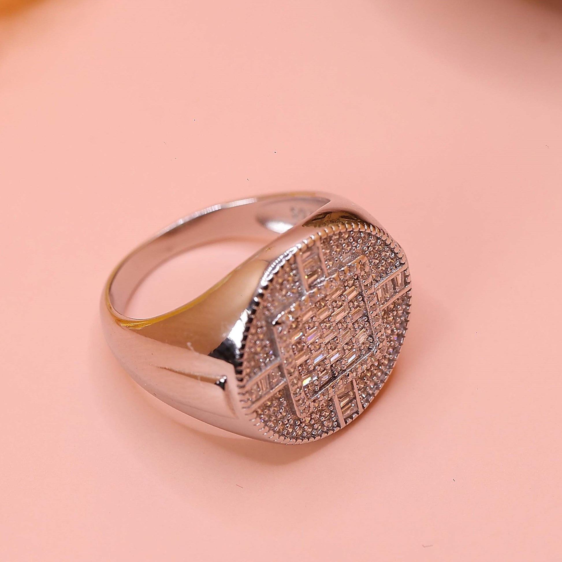 This premium men’s ring is crafted from high-quality 92.5 sterling silver, featuring a bold square face with an elegant geometric pattern. The finely detailed surface is enhanced with shimmering micro-set stones that add a refined sparkle without being overpowering. Its high-polish finish and solid band ensure durability, comfort, and a luxurious feel.