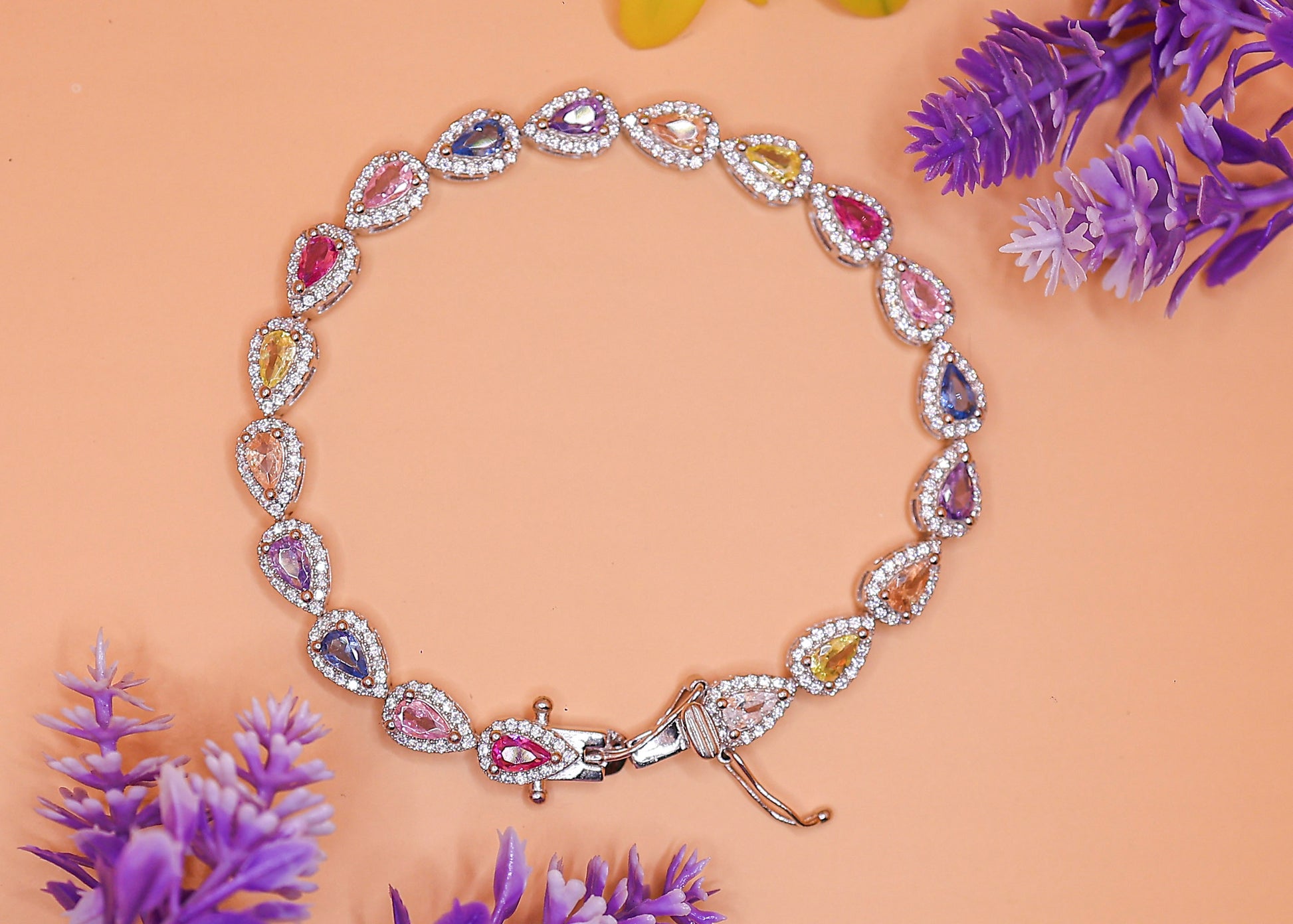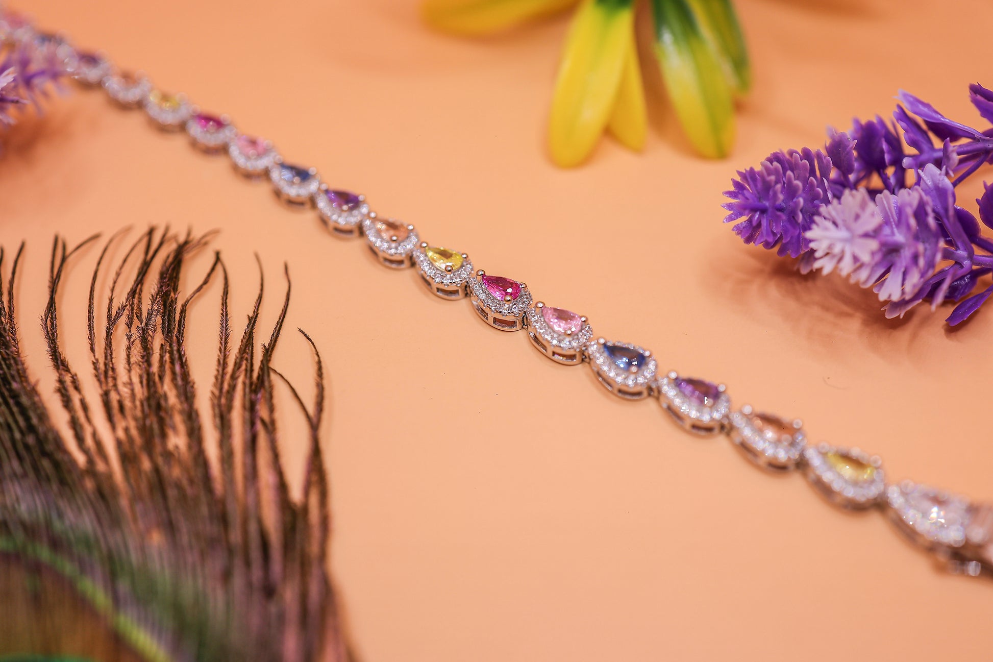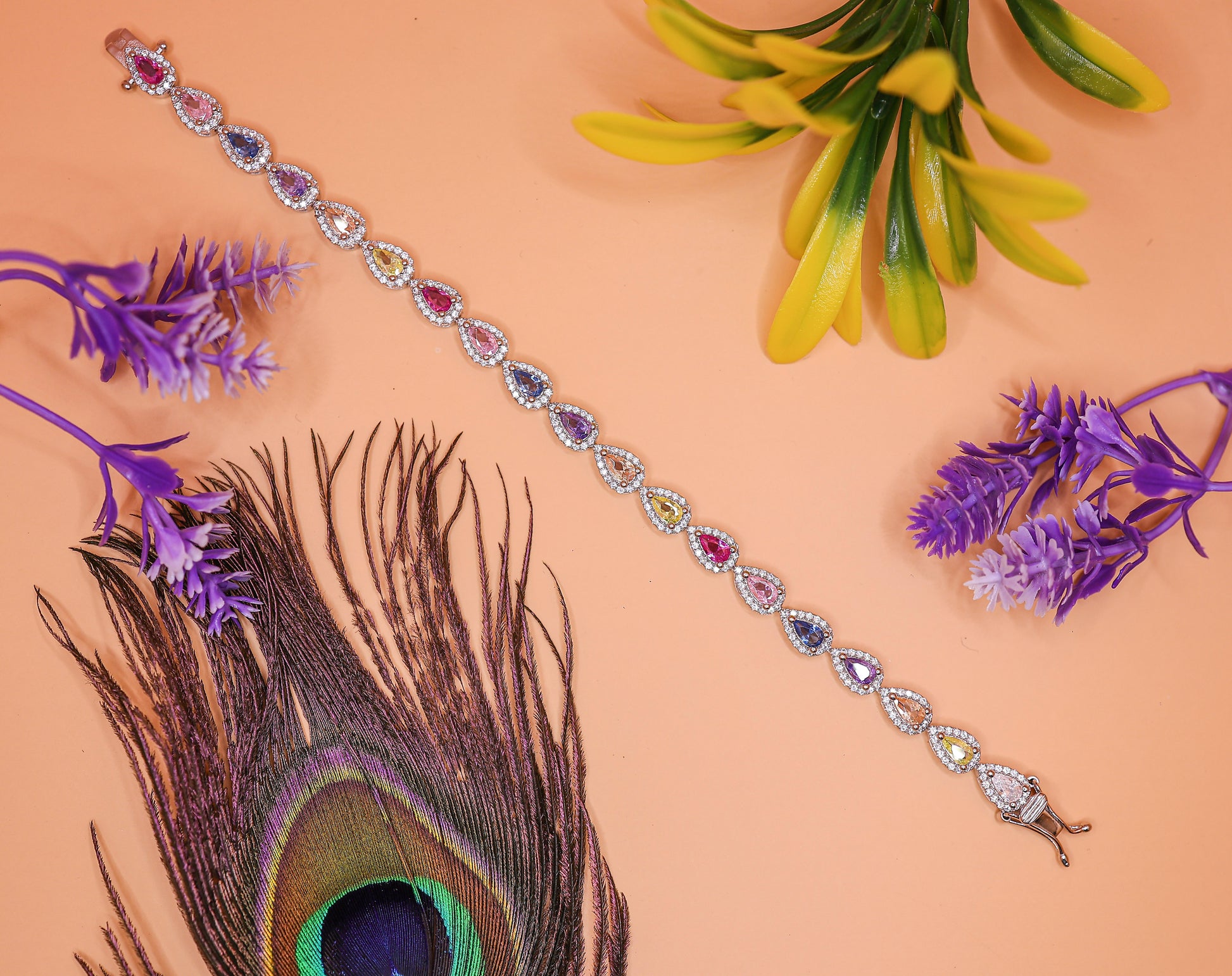 Crafted in 925 silver, this bracelet showcases a radiant array of colored teardrop stones symbolizing positivity, joy, and confidence. The intricate stone setting and diamond-cut sparkle make it perfect for festive and everyday luxury wear.