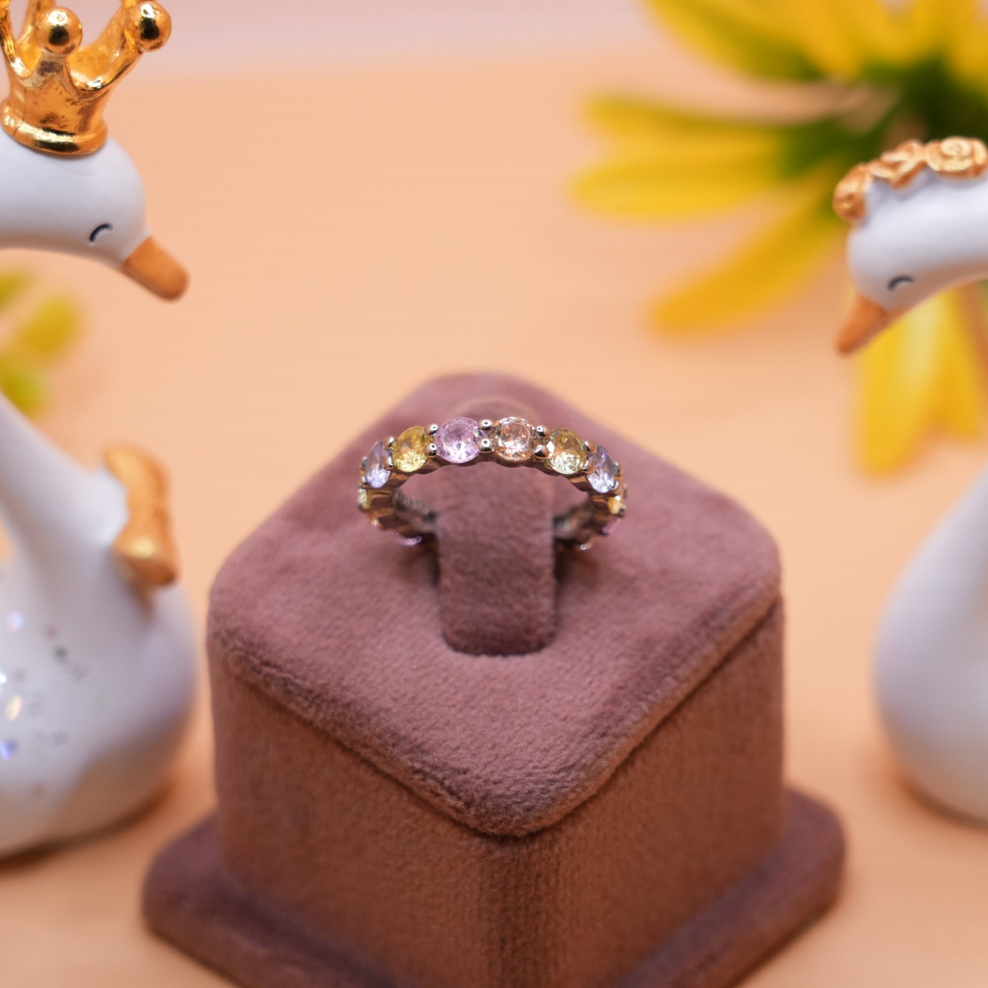 A seamless row of multi-color round-cut stones—soft pinks, sunshine yellow, lilac, and champagne tones—creates a refined rainbow effect. Set on a polished silver band, it’s light, joyful, and endlessly wearable.