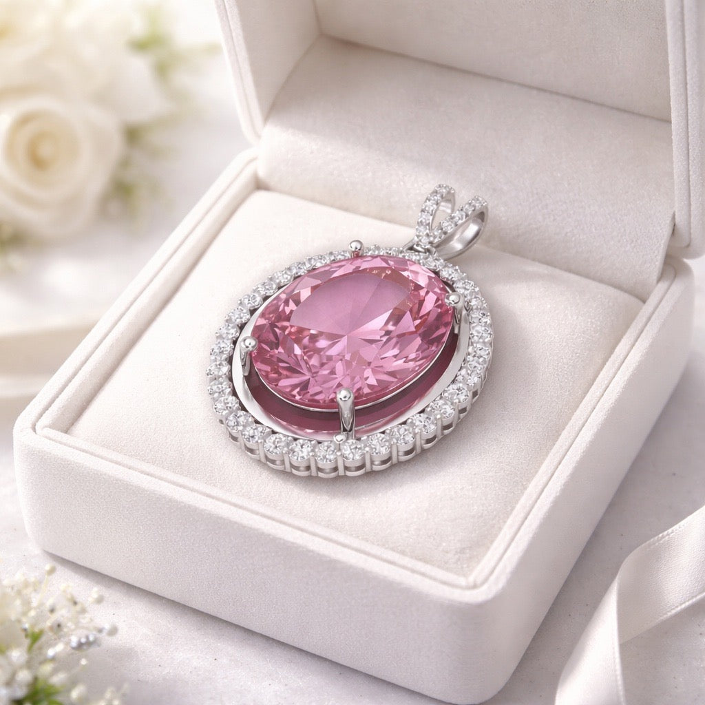 Is pendant ke center mein oval-cut rose pink stone diya gaya hai, jiske around sparkling halo-set clear stones lage hue hain, jo isse premium diamond-like shine dete hain.