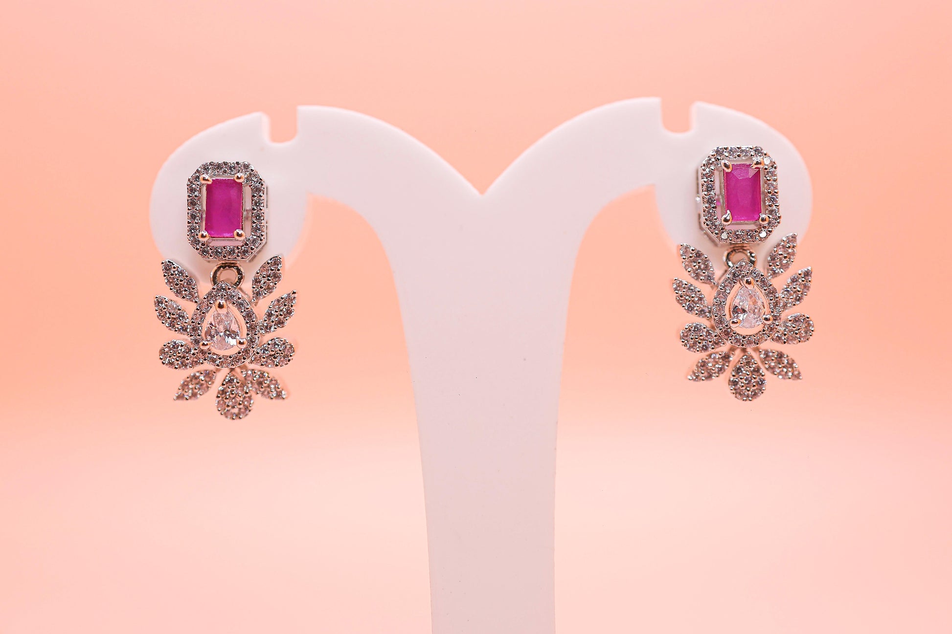 Design: It has a bold, Ruby Pink (or Magenta/Fuchsia) Rectangular/Octagonal stone setting at the earlobe. The drop features a sparkling leaf/floral pattern cluster, creating a balanced and elegant look.