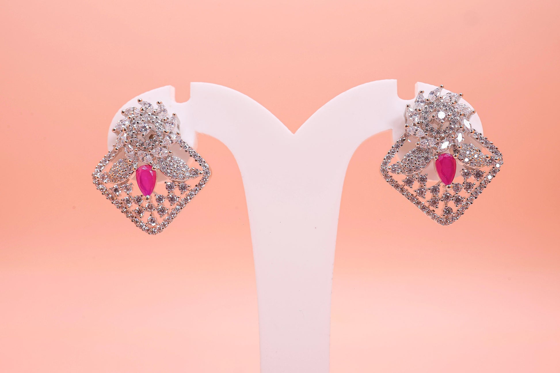 This exquisite 92.5 sterling silver pendant set features a royal pear-shaped ruby centerpiece surrounded by a stunning lattice of sparkling zircon stones. The intricate floral top motif adds a regal charm, while the wide, artistic base ensures a grand and luxurious look.