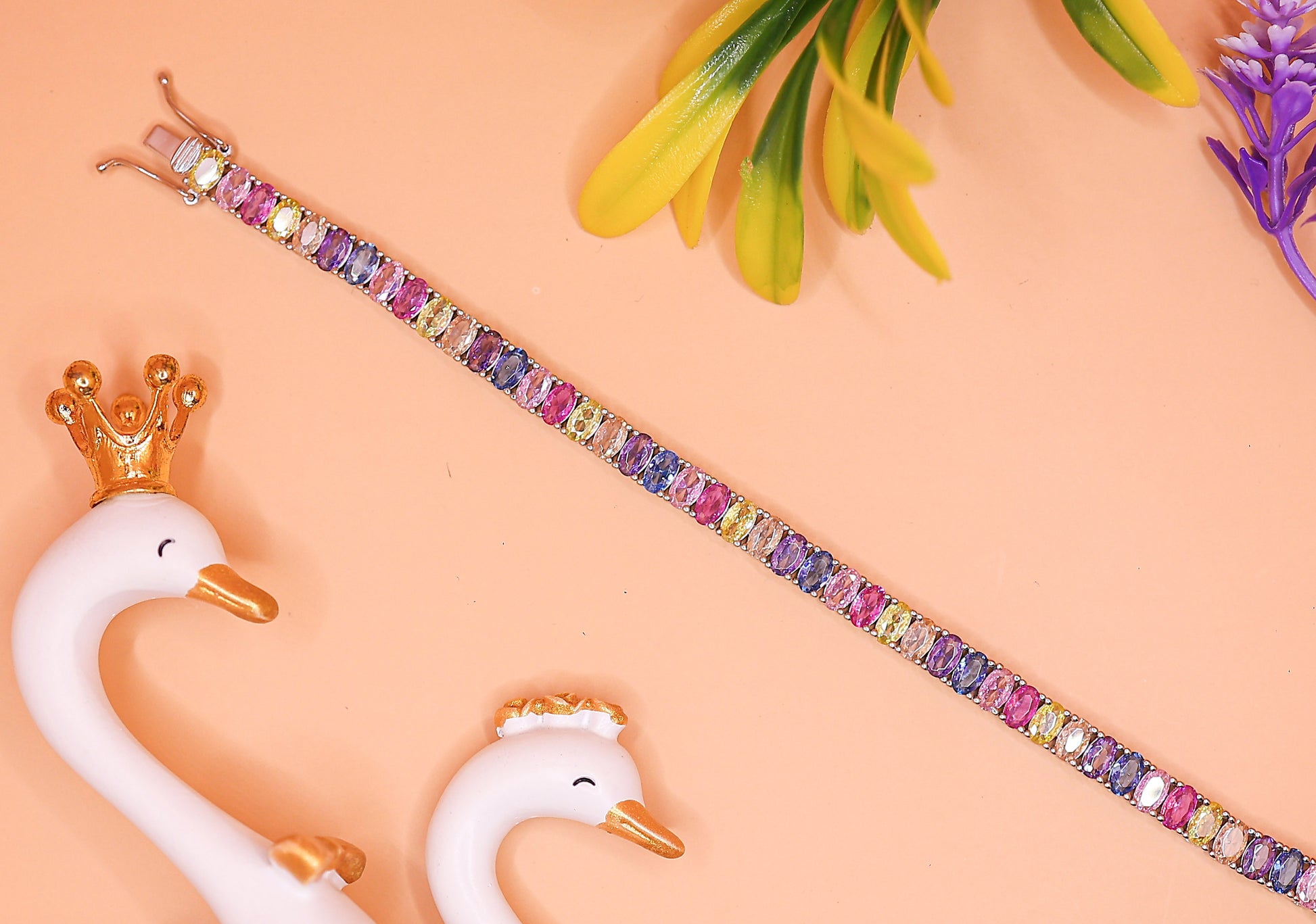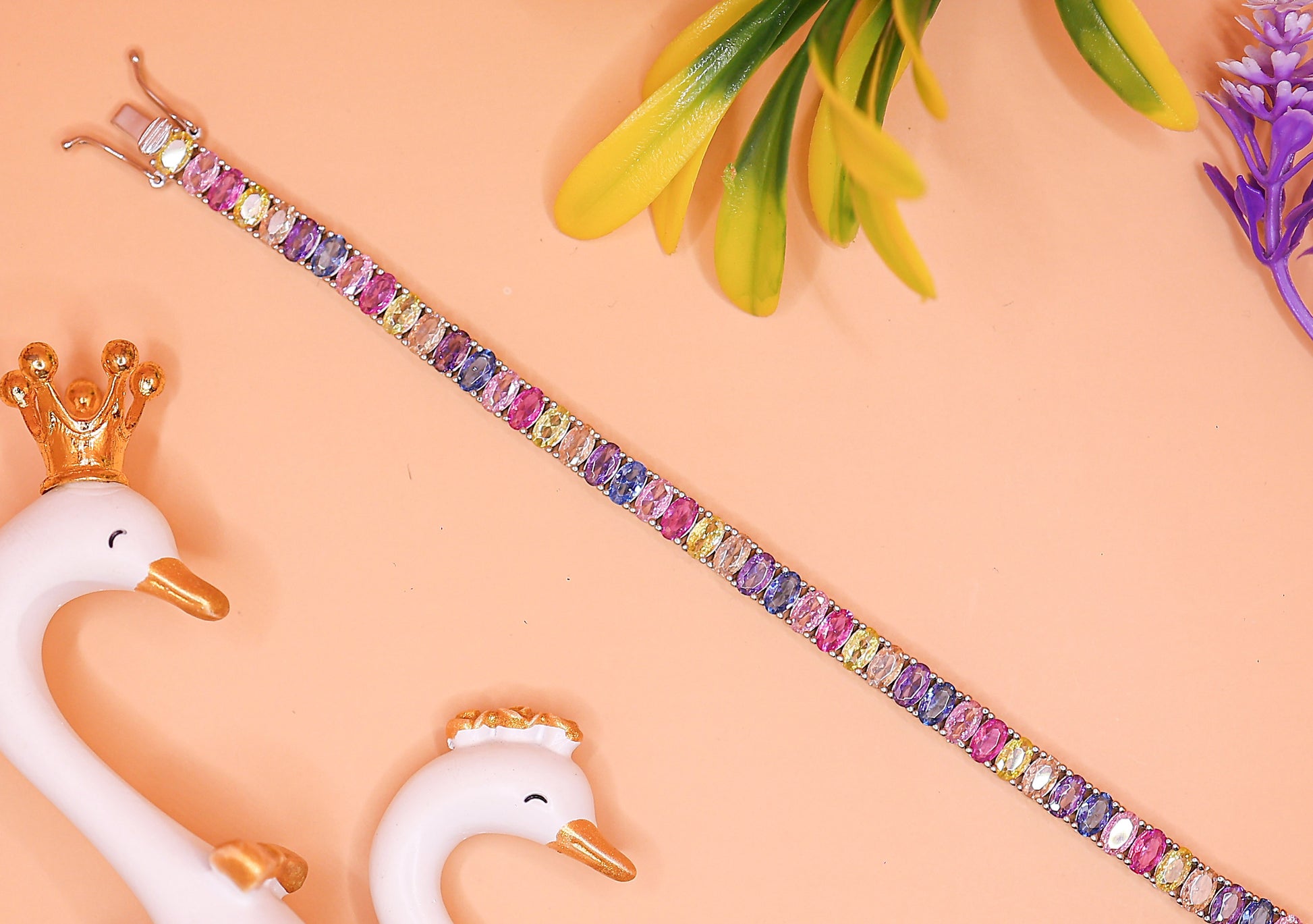 The Rainbow Lucky Bracelet is a stunning silver piece featuring a line of multi-colored stones symbolizing joy, hope, and positivity. The vibrant colors make it fun and stylish,